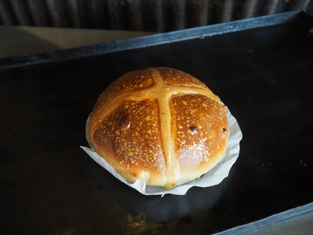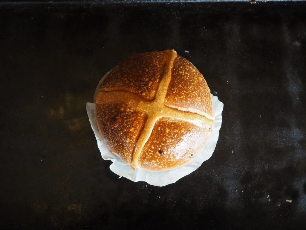 Our oversized 18cm hot cross bun can be sliced, toasted, generously buttered and shared. It is big, fluffy, soft and absolutely delicious and filled with delicately spiced fruit. The perfect Easter teatime treat to enjoy with friends and family.